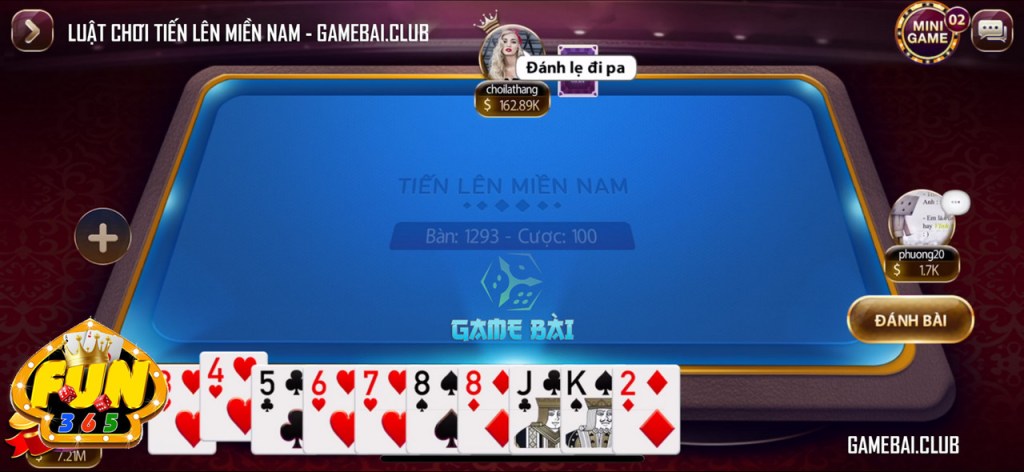 Tiến lên miền Nam chơi online trên hệ thống fun365 club nhanh gọn và luôn tiện lợi, công bằng hơn cực kỳ rộng rãi cho các người tương đối nhút nhát so mang chơi TLMN tại những chiếu bài bên cạnh đời. Cùng chơi game bai trên hệ thống fun365 club, cổng game bài đổi thẻ với các mức cược phong phú, lề luật minh bạch, công bằng có mọi người chơi. Thưởng tiền hậu hĩnh, đổi thẻ nhanh chóng.